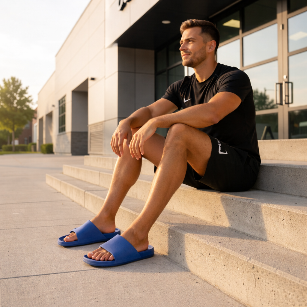 Nach dem Training brauchen deine Füße Erholung statt Belastung. Die Recovery Slides unterstützen die Durchblutung und lockern verspannte Fußmuskeln.