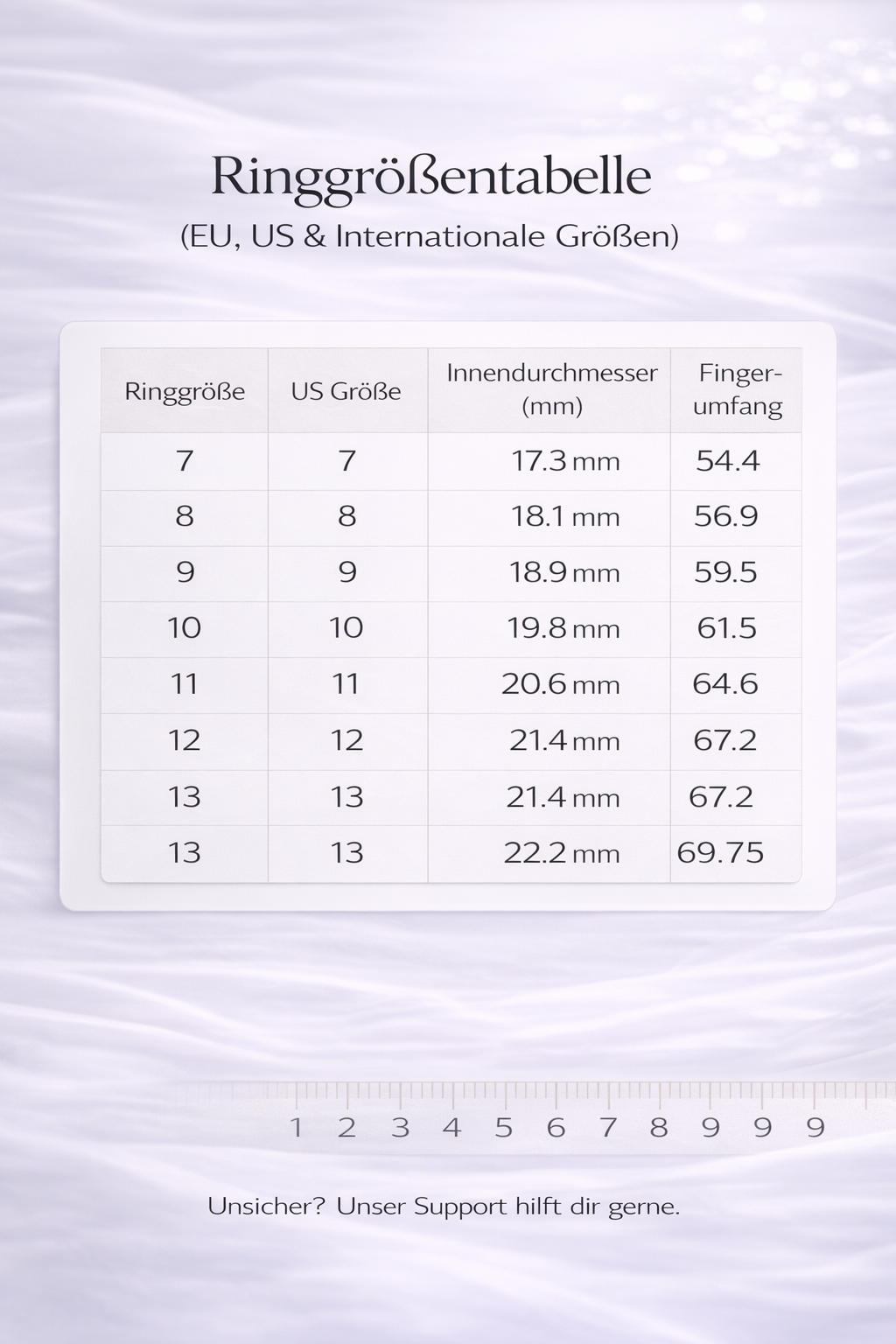 Wir empfehlen dir, vor dem Kauf deine Ringgröße zu messen. Alternativ bieten wir eine einfache Größentabelle im Shop, die dir weiterhilft.