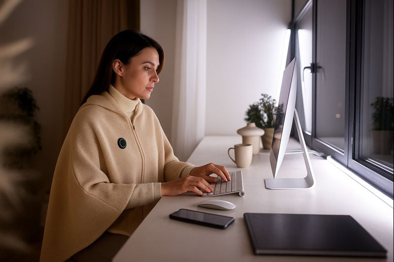 „Home‑Office, Sofa, Bücher – auch drinnen merke ich den Unterschied. Ich ziehe das Cape morgens an und bleibe warm, ohne dicke Pullis oder Heizlüfter. Es fühlt sich luxuriös und weich an, fast wie ein Zuhause‑Gefühl.“